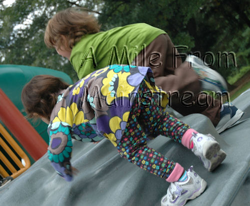 Sully going down the slide with Eloise. Daddy helped, and supported.